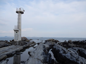 岩場の先端まで来ました。こちらには間口港燈台と書いてありました。
